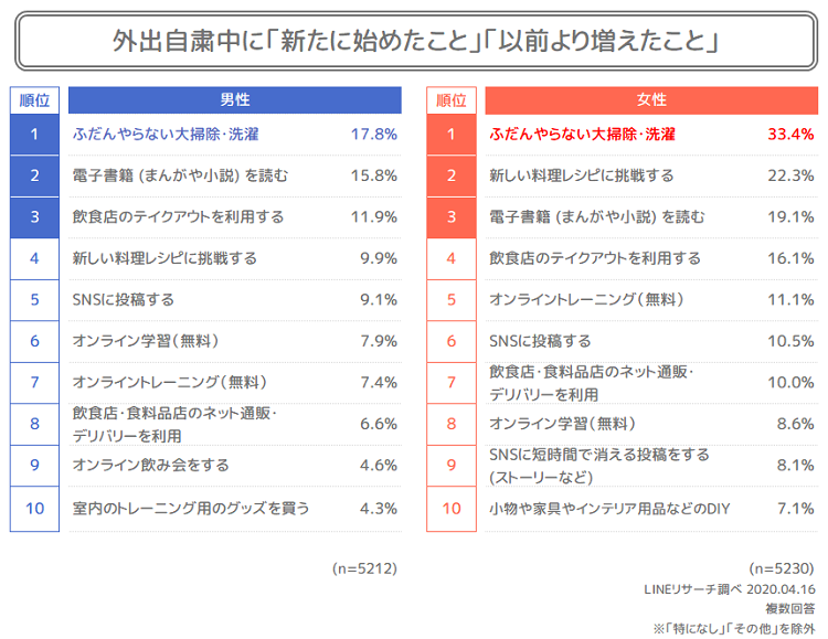 3.飲食店・居酒屋に行く」は男女ともに自粛。新たに始めたことは「掃除」、「料理」、「電子書籍」など