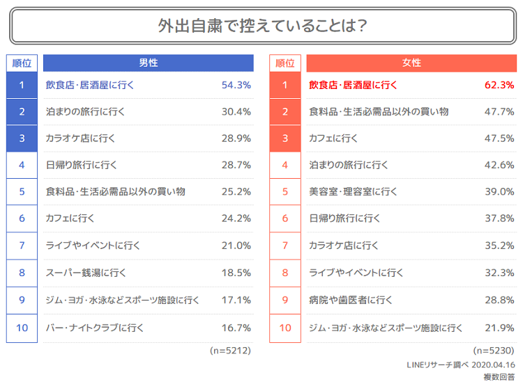 女性は、「(食料や生活必需品以外の)買い物に行く」や「美容室に行く」など、ファッションや美容など会社帰りやお休みの日にしていたような行動も控えていることがわかります。
