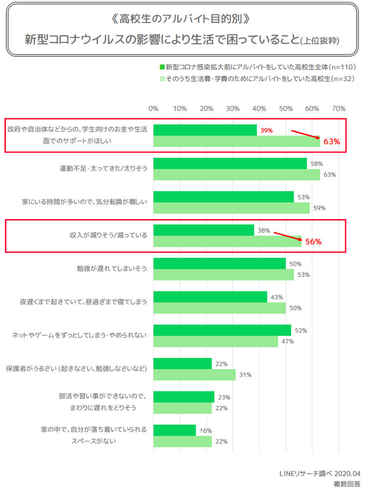 なお、コロナ禍によるアルバイトの減収は、日々を支える収入を一部担っている高校生にとっては非常に大きな問題です。この問題へのサポートや情報提供が適切に行われるにはどうするべきか考えていきたいと思います。
