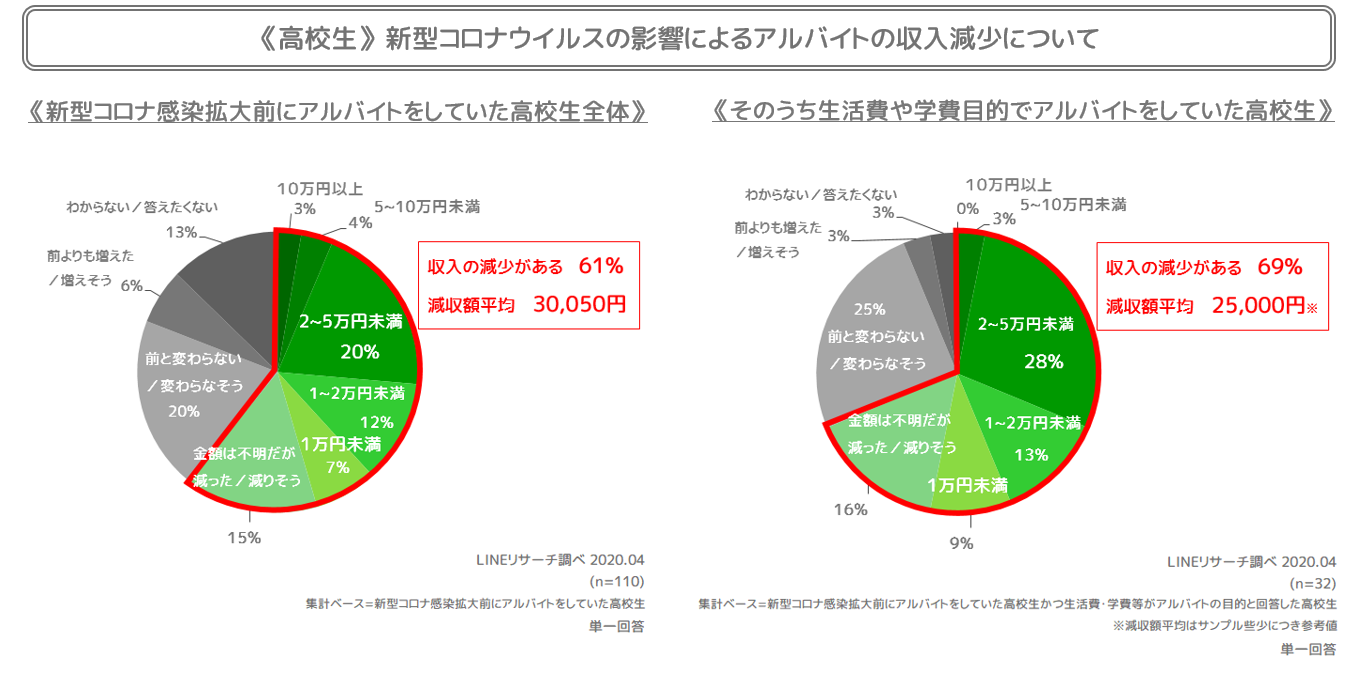 さらに、それを「生活費や学費目的でアルバイトをしていた高校生」に絞ると(下部右円グラフ)、収入が減少した割合が7割弱となっています。全体と比較すると2万円~5万円未満の減収割合が高くなっています。