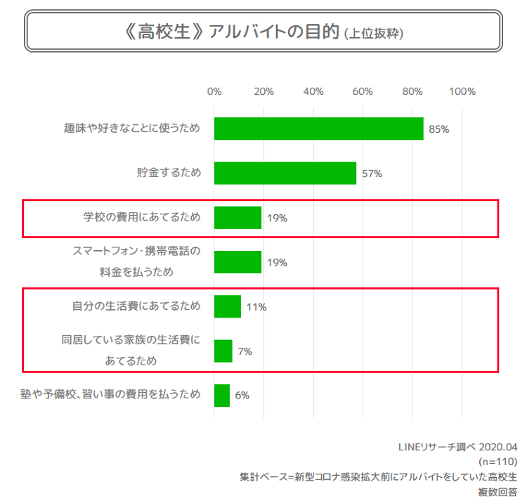 しかし一方で、「学校の費用にあてるため」「自分の生活費にあてるため」「同居している家族の生活費にあてるため」といった生活必要度の高い目的の回答も1~2割ずつみられました。