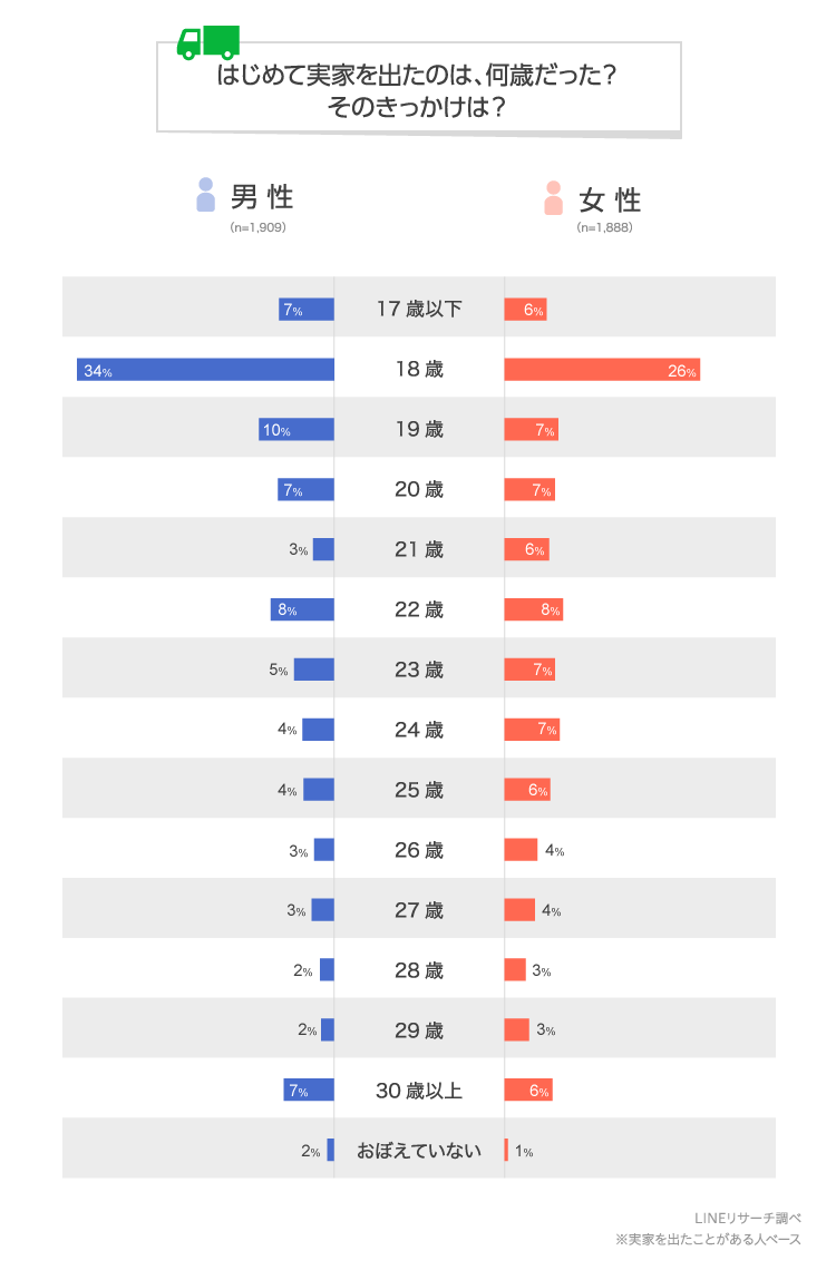 1.実家を出た後は、男性も女性も「1人暮らし」が多数2.はじめて実家を出た年齢でもっとも多いのは「18歳」