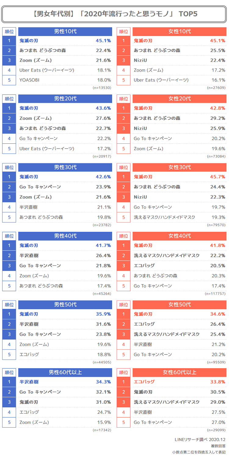 1.「鬼滅の刃」が堂々1位!総合ランキング2.年代別ランキング。「半沢直樹」、「エコバック」、「あつ森」などが上位に