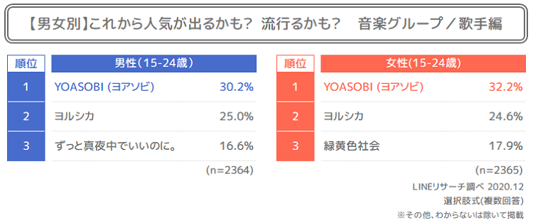 『音楽グループ/歌手編』、こちらも男女共通で「YOASOBI」がランクインしました。