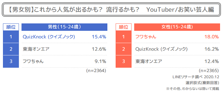 『YouTuber/お笑い芸人編』では、男性は東大クイズ王、伊沢が率いる「QuizKnock」が1位となりました。女性は、「フワちゃん」が1位。どちらもすでにメディアでも多く登場する人気YouTuberではありますが、今後もさらなる活躍が予想されているようです。