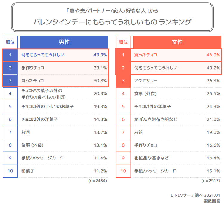 2月14日のバレンタインデー。チョコレートをおくったり、買ったりする人が多いイベントですが、実際に、どんなものをもらったらうれしいのでしょうか。バレンタインデーに恋人、好きな人、妻や夫、パートナーからもらったらうれしいものを男女別に聞いてみました。