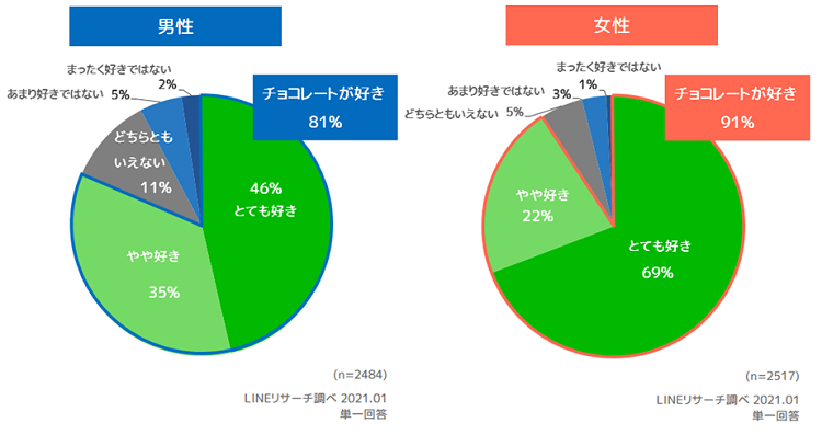 男女別にみてみると女性は約9割、男性でも8割以上の人が「チョコレートが好き」という結果になりました。女性のほうが甘いものが好きというイメージがあるかもしれませんが、男性もチョコレートが好きな人が多いことがわかります。