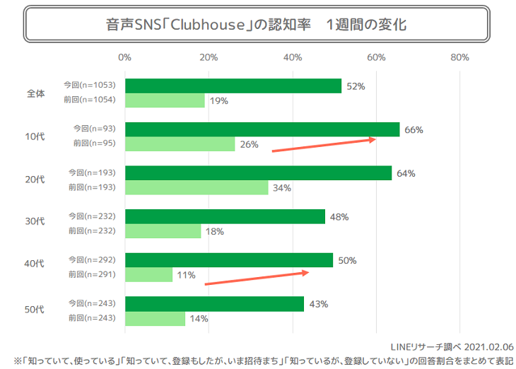 1.「Clubhouse」の認知は52%、1週間で2.7倍の伸び2.利用率は4%、若年層では他の年代の2倍