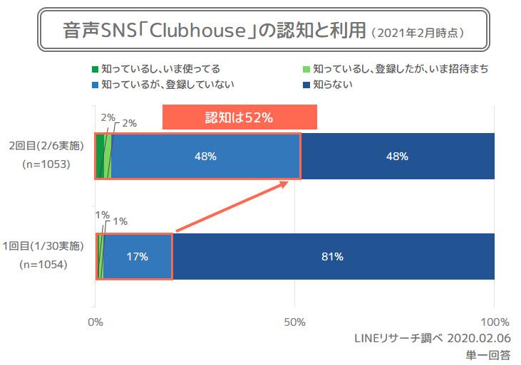 1.「Clubhouse」の認知は52%、1週間で2.7倍の伸び