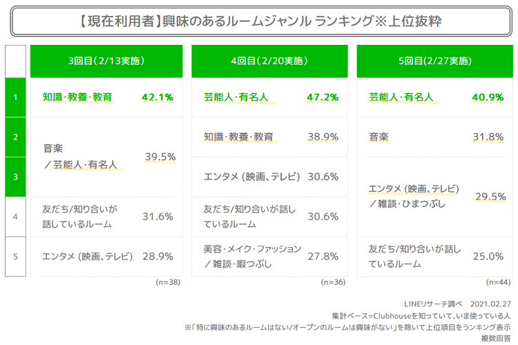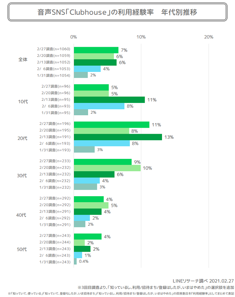 LINEリサーチでは、急速に拡大するClubhouse に注目し、1/30から第1回調査を開始、以後1週間ごとに定期的に調査を実施していました。今回は、第4回(2/20実施)、第5回(2/27実施)の2回分の結果を加え、約1か月間の推移や変化についてご紹介いたします。