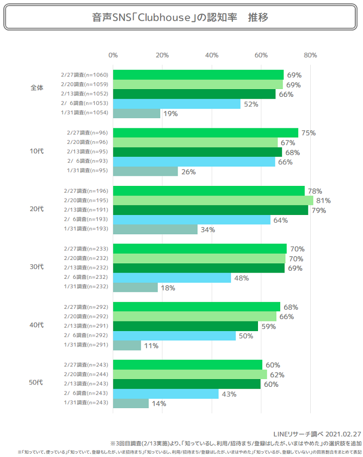 5回目となる最新の調査結果では、Clubhouseの認知率は69%と、約7割の人が認知していました。
