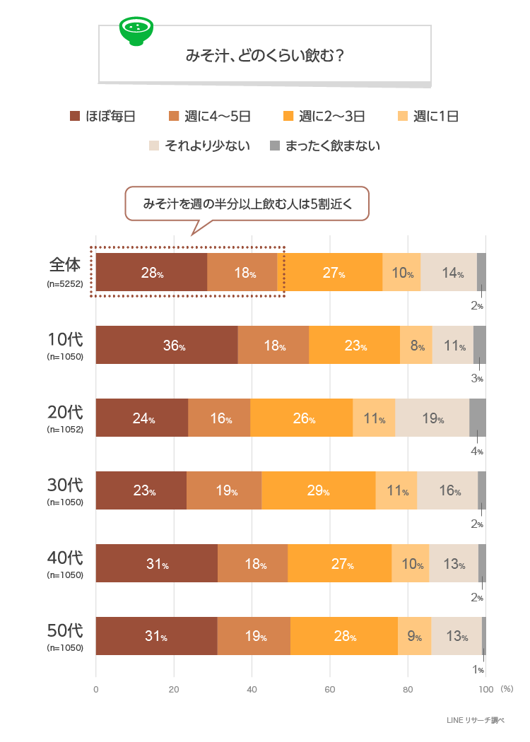 グラフにはありませんが、エリア別の傾向をみてみると、東日本の地域では西日本の地域に比べるとみそ汁を飲む頻度が高く、その中でも特に東北地方の頻度が高くなっていました。米どころといわれる東北地方や信州地方はみその生産量が高い地域で、みそ汁も日常的な献立として定着しているのかもしれません。