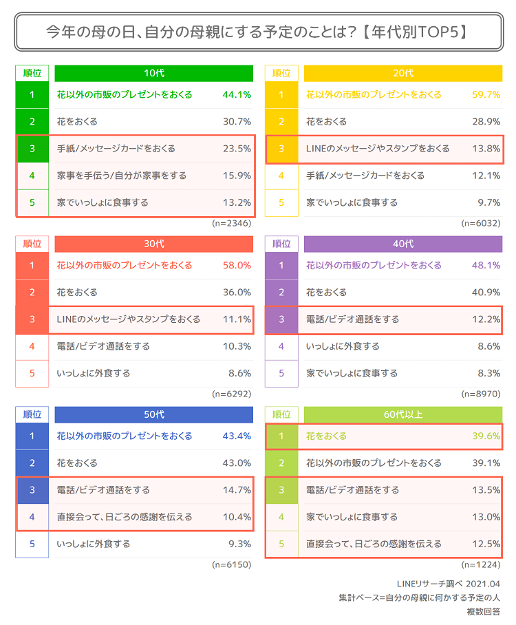 各年代で特徴的な点をみてみると、10代は「手紙/メッセージカードをおくる」が2割を超え、「家事を手伝う/自分が家事をする」が高くなっています。この年代は母親と同居している可能性も高く、同居ならではのできることの割合が高いのかもしれません。10代と60代では「家でいっしょに食事をする」割合も高いことがわかりました。20~30代では「LINEのメッセージやスタンプをおくる」、40代以上では「電話/ビデオ通話をする」が3位にランクインしています。離れて暮らしている母親に連絡をするいい機会なのかもしれません。また、50代以上では「直接会って日ごろの感謝を伝える」も上位に入っています。ランキング外ですが60代以上では「お金をわたす・おくる」も6位となりました。