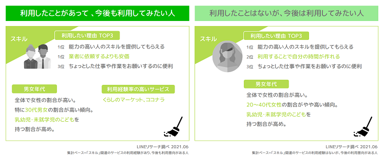「スキル」関連のサービスで「利用したことがあって、今後も利用してみたい人」は全体で女性の割合が高い傾向です。男女年代別では30代男女の割合が高く、また、乳幼児・未就学児のこどもを持つ人も他の分野に比べて高くなっています。利用経験率の高いサービスは「くらしのマーケット」が約4割となっています。利用したい理由では「能力の高い人のスキルを提供してもらえる」や「業者に依頼するよりも安価」ということが利点のようです。