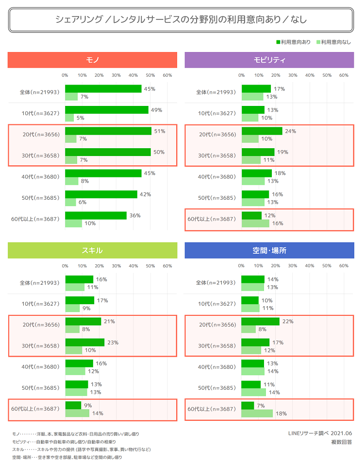 そこで今回は全国の男女約2万人を対象に「シェアリング/レンタルサービス*」について【買う・借りる側】として利用することをメインに4つの分野ごと(モノ、モビリティ、スキル、空間・場所)の認知や利用状況、また利用・非利用意向の理由などを聞いてみました。また、年代別に価値観や意識の違いがあるのかどうかをみていきましょう。