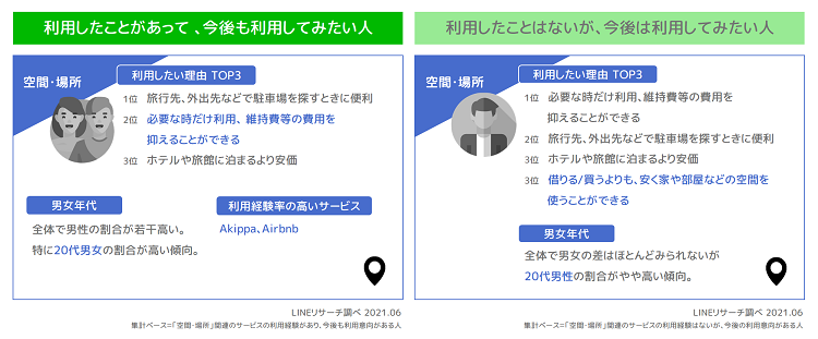 「利用したことはないが、今後は利用してみたい人」は全体で男女の差はほとんどなく、男女年代別では、20代男性で割合がやや高い傾向でした。現在利用していない人にとっては、「借りる/買うよりも、安く部屋などの空間を使うことができる」ということを利点として感じているようです。空間・場所のサービスについては、いずれも共通して「利便性」「コスパ」といった部分が魅力となっているようです。