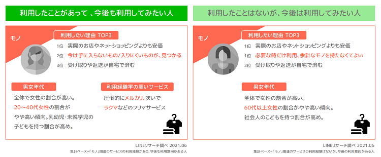 「モノ」関連のサービスでは「利用したことがあって、今後も利用してみたい人」は男性よりも女性の割合が高く、特に20~40代女性の割合が高い結果に。利用経験率の高いサービスとしては圧倒的に「メルカリ」が1位で約9割の人が利用しています。利用したい理由は、「実際のお店やネットショッピングよりも安価」が1位でした。次いで「今は手に入らない/入りにくいものが見つかる」となり、この理由は利用経験がある人のなかで上位となっています。