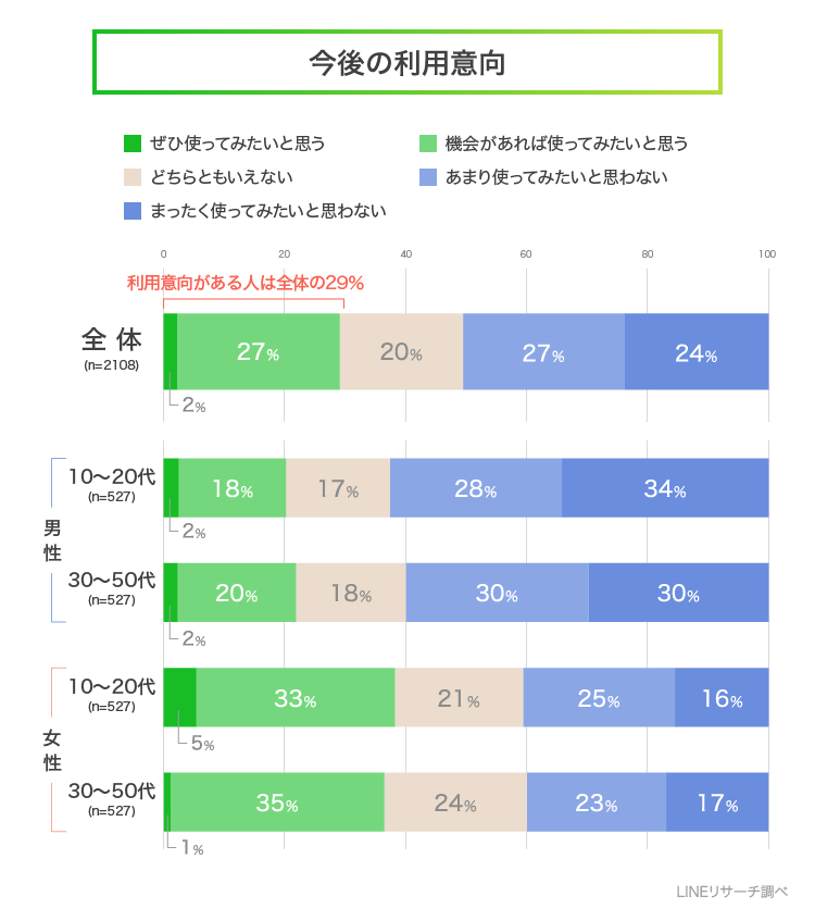 次に、今後の利用意向について回答してもらったところ、利用意向がある人の割合(「ぜひ使ってみたいと思う」「機会があれば使ってみたいと思う」の合計)は全体で29%でした。