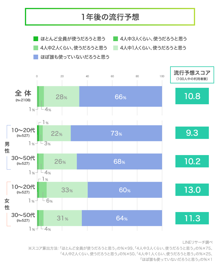 次に、「1年後、自分のまわりでどのくらいの人が使っていると思うか」を想像して答えてもらいました。グラフにある流行予想スコアは、100人中どのくらいの人が1年後に利用していそうかを算出した数値です。