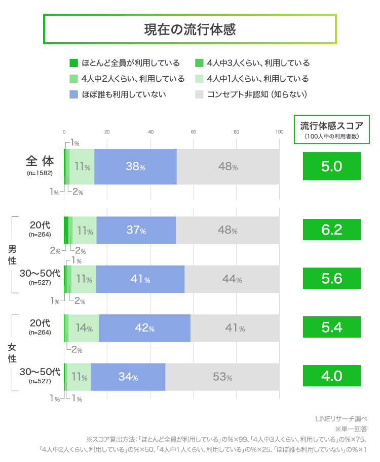 流行体感としては、全体で”およそ100人に5人が利用している”イメージを持たれているようです。そして、今から1年後には、現在の3倍以上である”およそ5人に1人くらいが利用していそう”というイメージを持たれています。