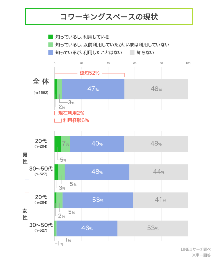 「コワーキングスペース」の現状について20歳以上の男女に調査したところ、主な結果は以下でした。