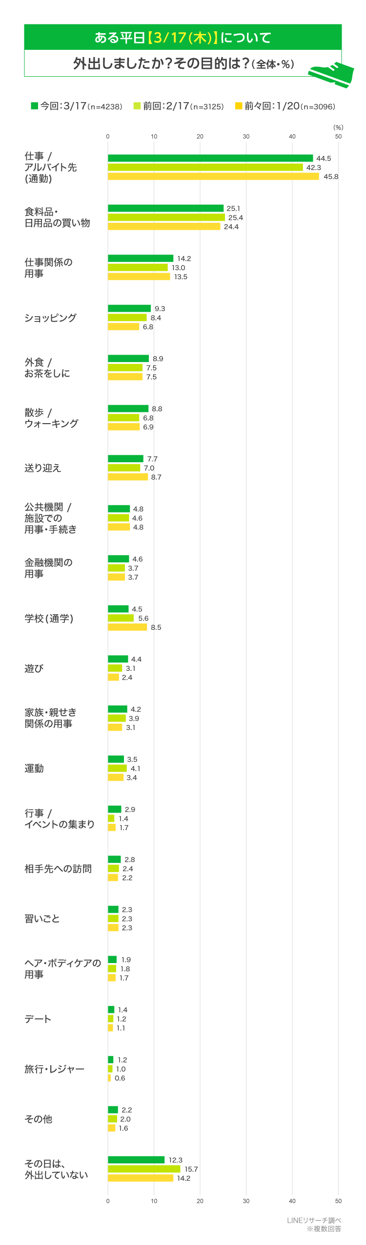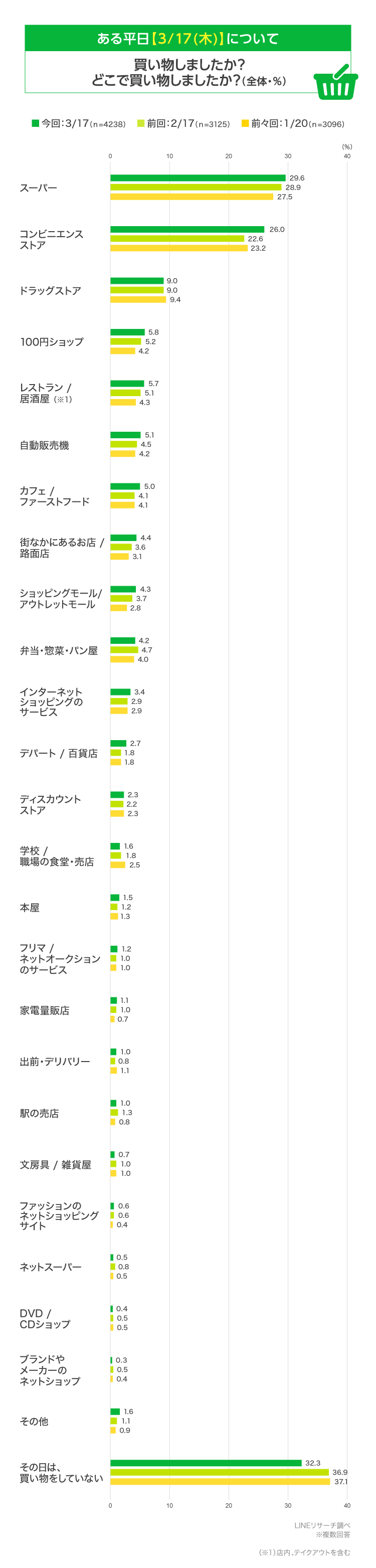 LINEリサーチでは、毎月第3木曜日の平日について、人々がどのような行動・コミュニケーション・消費をしているか、定期的に調査を行っています。今回は7回目として3/17(木)編をお届けします。前回の2月、前々回の1月実施時との変化もみていきます。
