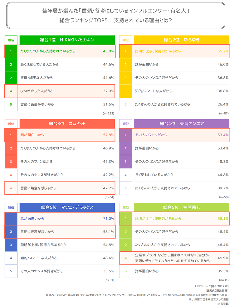 最後に、総合ランキングで上位となったインフルエンサー・有名人ごとの信頼/参考にされている理由をみていきましょう。