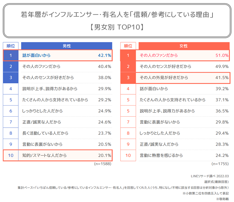 ゲーム系、美容系、アイドルやお笑いなど、さまざまなジャンルのインフルエンサー・有名人がランキングに並びましたが、若年層は、どういった理由で彼らを信頼/参考にしているのでしょうか。