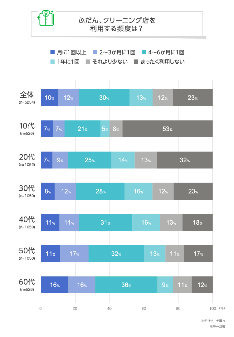 グラフにはありませんが、女性に比べて男性のほうが、クリーニング店を利用する頻度はすべての年代で高い傾向となり、特に30代以上ではその差が顕著となりました。男性は、スーツやワイシャツなど、クリーニング店にお願いしたい衣類が多いのかもしれません。