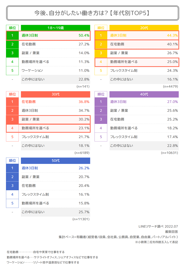 4. 今後したい働き方TOP2は「週休3日制」と「在宅勤務」で3割超