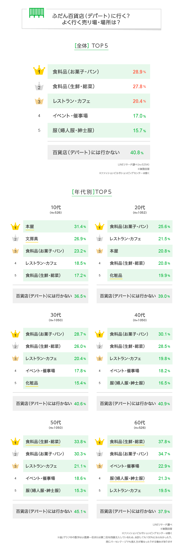 また、30代以上で「イベント・催事場」がTOP5に入っています。年代が上がるほど割合も高くなっており、40~60代女性では2割超となりました。