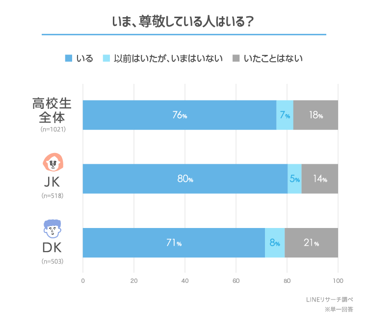 全体では、尊敬している人が「いる」と回答した高校生は7割超。高校生の76%の人が、いま現在尊敬する人がいることがわかりました。