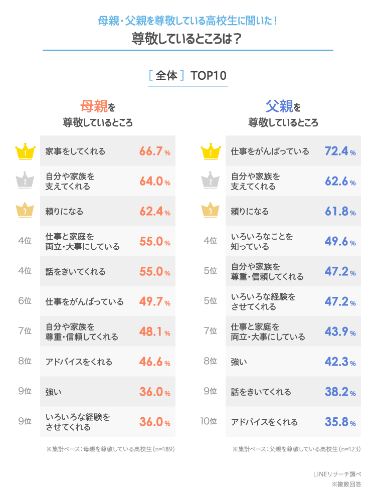 母親を尊敬しているところのTOPは「家事をしてくれる」で6割超となりました。2位は「自分や家族を支えてくれる」、3位は「頼りになる」でどちらも6割強の高い割合です。4位は同率で「仕事と家庭を両立・大事にしている」「話をきいてくれる」が5割超。高校生は、母親ががんばっている姿をふだんからよくみているようです。