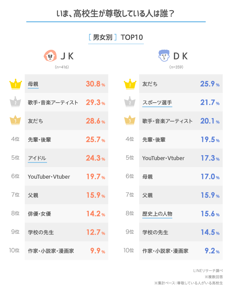 一方、DKでもっとも割合が高かったのは「友だち」で2割超。次いで「スポーツ選手」が2割強で続きます。また、「歴史上の人物」の割合もJKより高く、2割弱なっています。
