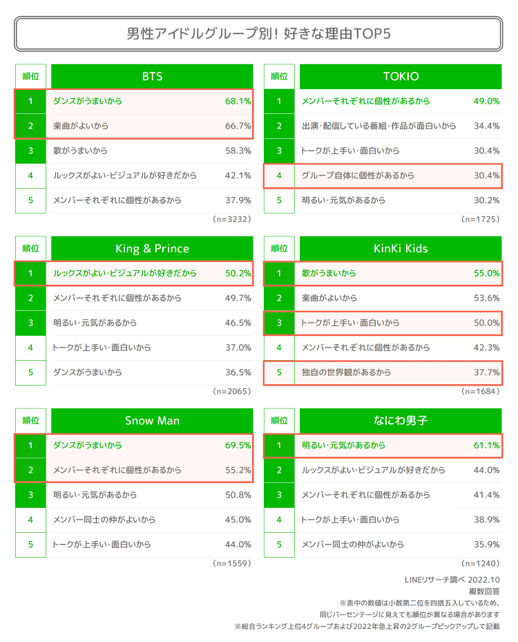 今年は、7位に「Snow Man」に、9位には「なにわ男子」がLINEアンケートで調査を実施して以来、初めてTOP10入りを果たしています。「Snow Man」はクオリティの高いダンスやアクロバットはもちろん、メンバー同士の仲の良さが人気のようです。関西ジャニーズJr.のグループ「なにわ男子」は、王道アイドルらしさに加えて、笑いのセンスもあるなど多角的な魅力があるようです。