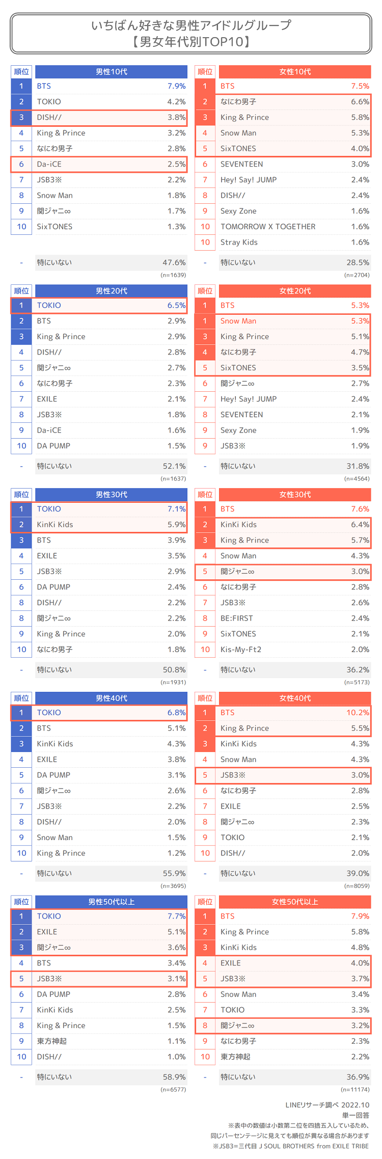 また、女性30代と男女50代以上では「関ジャニ∞」、女性40代以上と男性50代以上では「三代目 J SOUL BROTHERS from EXILE TRIBE」の割合が高くなっています。さらに、男女50代以上で共通して「EXILE」も他の性年代に比べて割合が高く、男性50代では2位でした。「JSB3※」のファンは「EXILE」が好きでその延長で好きになったという人やダンスが上手い、かっこいいという声も挙がっていました。