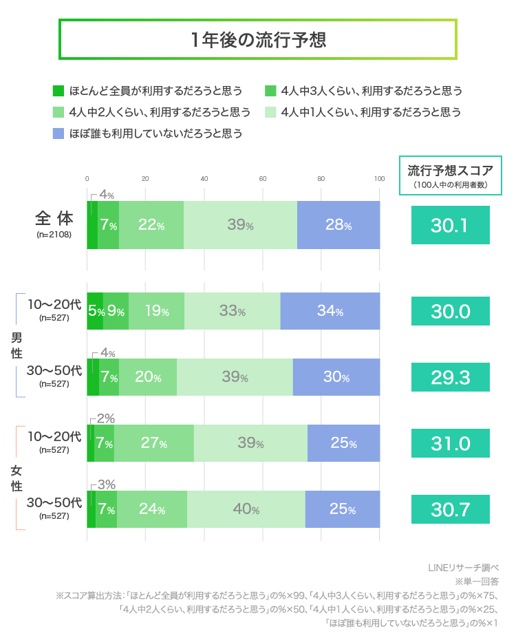 次に、「1年後、自分のまわりでどのくらいの人が利用していると思うか」を想像して答えてもらいました。グラフにある流行予想スコアは、100人中どのくらいの人が1年後に利用していそうかを算出した数値です。