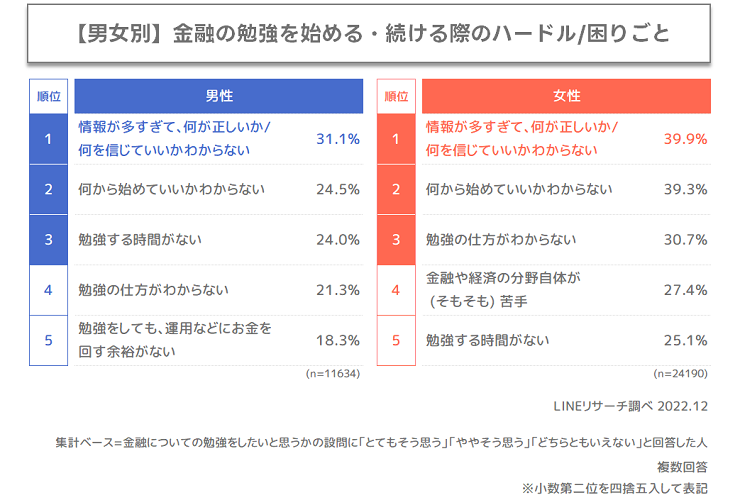 男女でみてみると、男性は「情報が多すぎて何が正しいか/何を信じていいかわからない」がもっとも高く3割超。次いで、「何から始めたらいいかわからない」、「勉強する時間がない」が2割台の僅差で続きます。「何から始めたらいいかわからない」は特に10代、20代で高い傾向となりました。