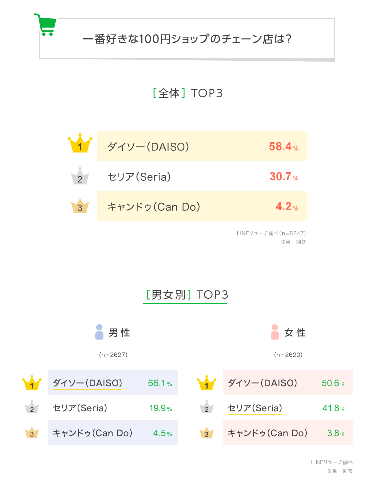 1.好きな100円ショップのチェーン店、男女ともに「ダイソー(DAISO)」がTOP
