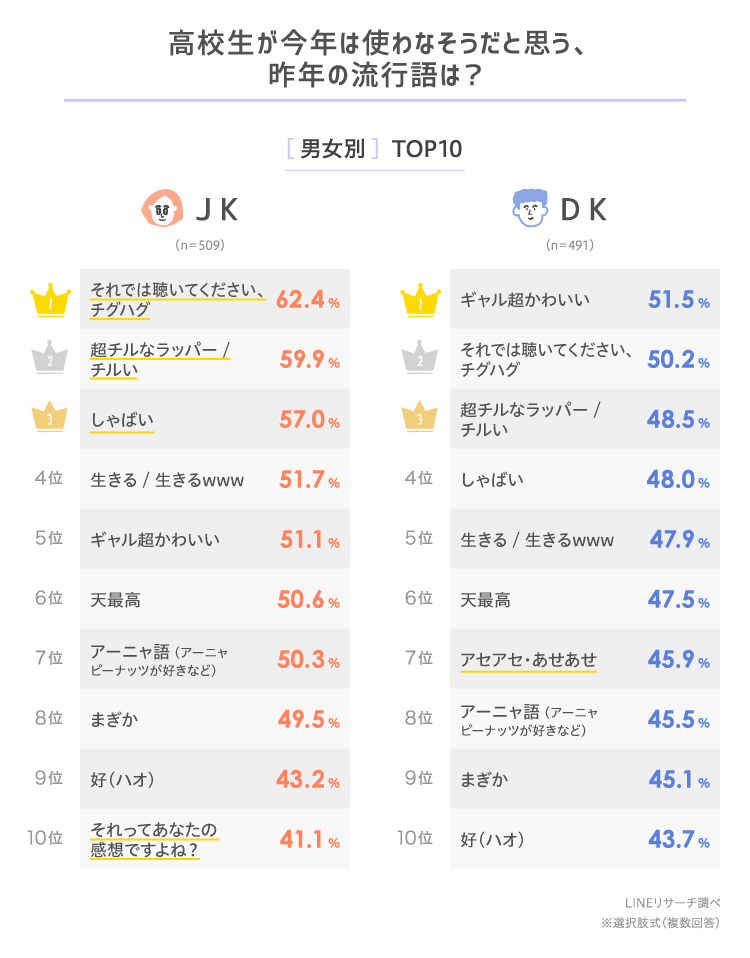「それでは聴いてください、チグハグ」「超チルなラッパー/チルい」「それってあなたの感想ですよね?」は、DKよりもJKで高い割合です。また、昨年の流行語ランキングでJKの4位・5位だった「天最高」「生きる/生きるwww」もランクインしています。
