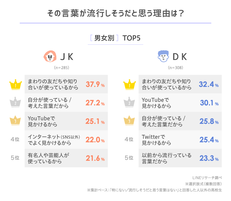 一方JKでは、2位以降は「自分が使っている/考えた言葉だから」「YouTubeで見かけるから」「インターネット(SNS以外)でよく見かけるから」が続き、5位の「有名人や芸能人が使っているから」はDKに比べてやや割合が高くなっていました。ランキング外ですが「TikTokで見かけるから」は、高1JKで3割弱と高めでした。