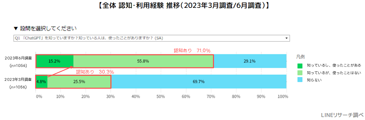 1.「ChatGPT」の認知は全体では約7割、前回調査から大幅に増加