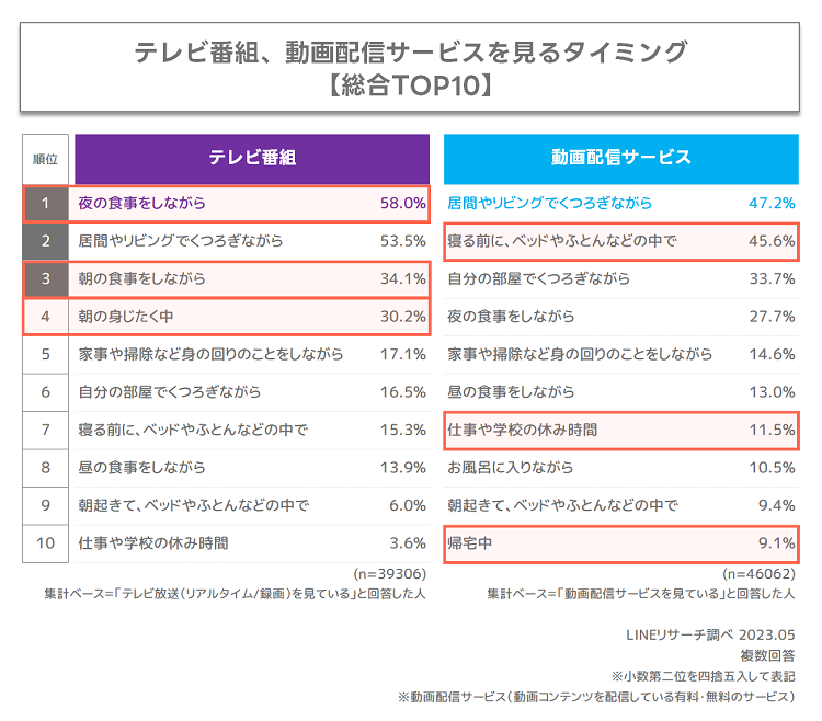 『テレビ番組』と『動画配信サービス』を見るタイミングの共通点として、食事中やリビングなどでくつろいでいるときに番組やコンテンツを楽しんでいる様子がうかがえます。