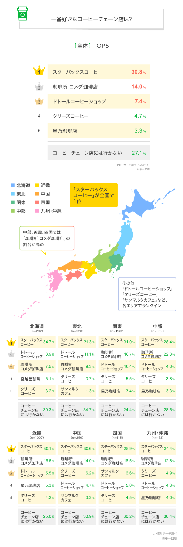 そのほか北海道を中心に展開する「宮越屋珈琲」は北海道で4位にランクイン。「タリーズコーヒー」は、中国、九州・沖縄で3位。「サンマルクカフェ」は、四国で3位にランクインし、他のエリアと比べてやや高めの割合でした。