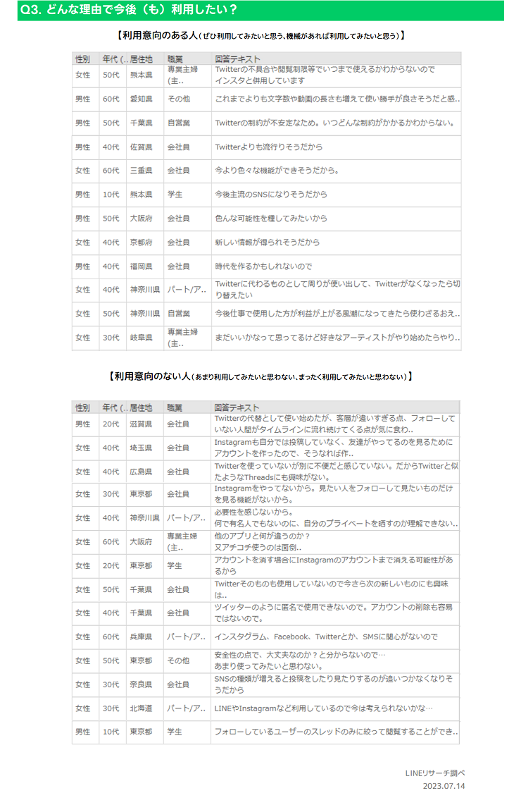 「Threads」について利用意向のある人、利用意向のない人とそれぞれその理由を自由回答形式で聞きました。
