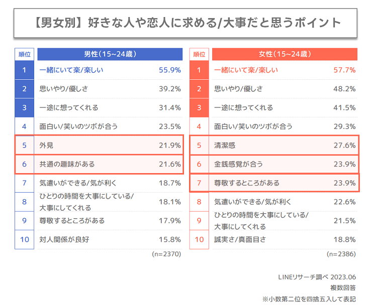 5位以降で男女の傾向に違いがみられます。男性は、5位に「外見」、6位に「共通の趣味がある」が2割台となりました。これらの項目は女性よりも7ポイント以上高く、男性のほうが重視している様子です。 女性は、5位以降に「清潔感」「金銭感覚が合う」「尊敬するところがある」が入りました。 中でも「清潔感」は男性に比べ10ポイント以上高い項目となりました。