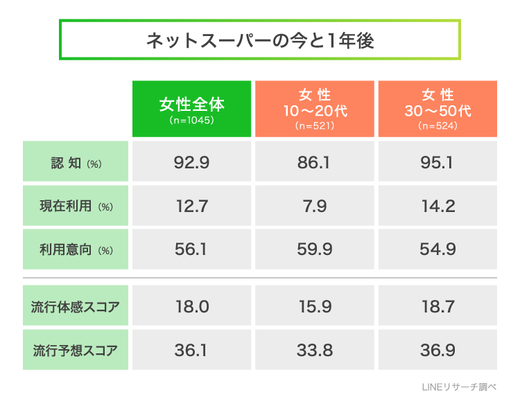 その結果「ネットスーパー」の流行体感スコアは女性全体で「18.0」で、およそ6人に1人が利用しているイメージを持たれていることがわかります。