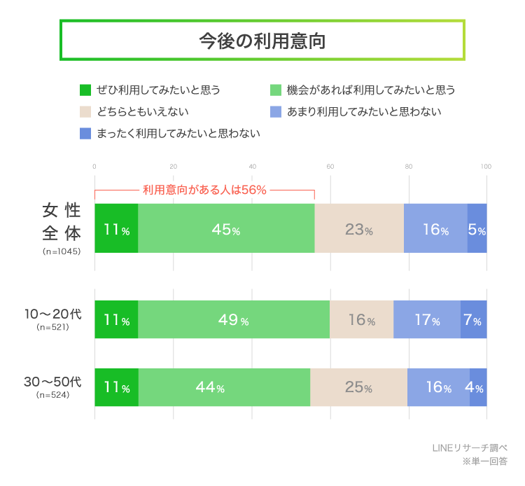 次に、今後の利用意向について回答してもらったところ、利用意向がある人の割合(「ぜひ利用してみたいと思う」「機会があれば利用してみたいと思う」の合計)は女性全体で56%となりました。