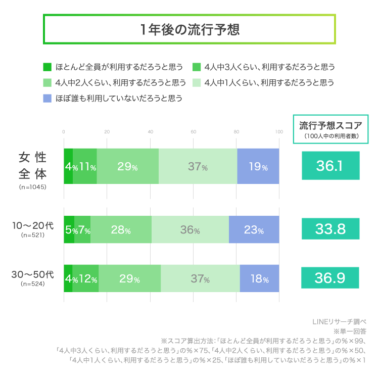 グラフにある流行予想スコアは、100人中どのくらいの人が1年後に利用していそうかを算出した数値です。