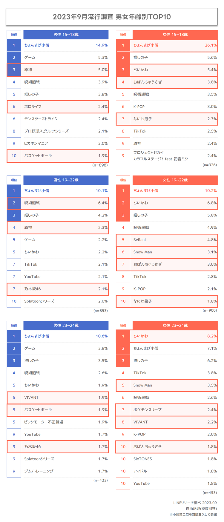 男女年齢別にみると、総合1位の「ちょんまげ小僧」は女性23~24歳では2位となったものの、ほかすべての年代でTOPとなりました。総合2位の「推しの子」は男性15~18歳を除くすべての年代でTOP3に入りました。総合4位の「ちいかわ」や、総合9位の「おぱんちゅうさぎ」は、特に女性の間でトレンドとなっている様子です。女性23~24歳では「ちいかわ」が1位となり、「おぱんちゅうさぎ」は女性15~18歳でTOP5に入りました。